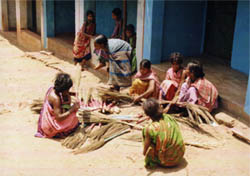 Training on broom making was conducted in Jhimkiguda village from 7th April to 17th April 2000. Training was imparted to 30 persons(20 males & 1 0 females) from three Adivasi villages. The module of the training consisted on broom stick cuttings, shortening of broom sticks, broom bindings, combination of unparalleled broom sticks into a single unit. The distinct size and weight of broom sticks are @ 39" of 350 gms @ 36" of 3OOgms and @ 33' of 250 gms. Further, after accomplishing their task they were engaged in the processing of broom under the Mahila Mandal NTFP processing centre. Mass production of brooms was undertaken.